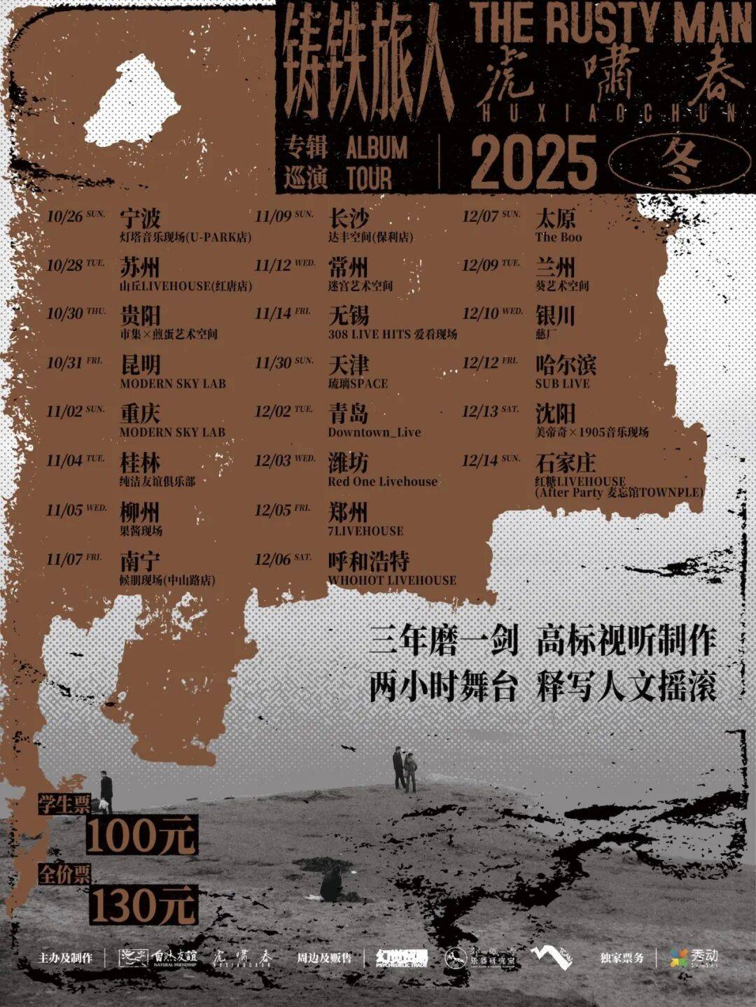 继虎啸春「铸铁旅人」夏巡之后,乐队将于秋冬交替之季再次出发。夏巡是一场相互治愈的经验置换,他们与听众一起经历这些起起落落,巡演结束后久久脱离不出来那种状态,真的就是一记闷棍如梦如幻,还好还好,马上就又要开始了,这次他们将前往更多的地方,继续他们的「铸铁」,铸得火星四射,铸得浓烟飞天,铸得你我都拥有一副坚韧的躯体。一起抵御风雨、昂首挺立,直到与最后的炭心打上照面。朋友们,凛冬将至,现场见。