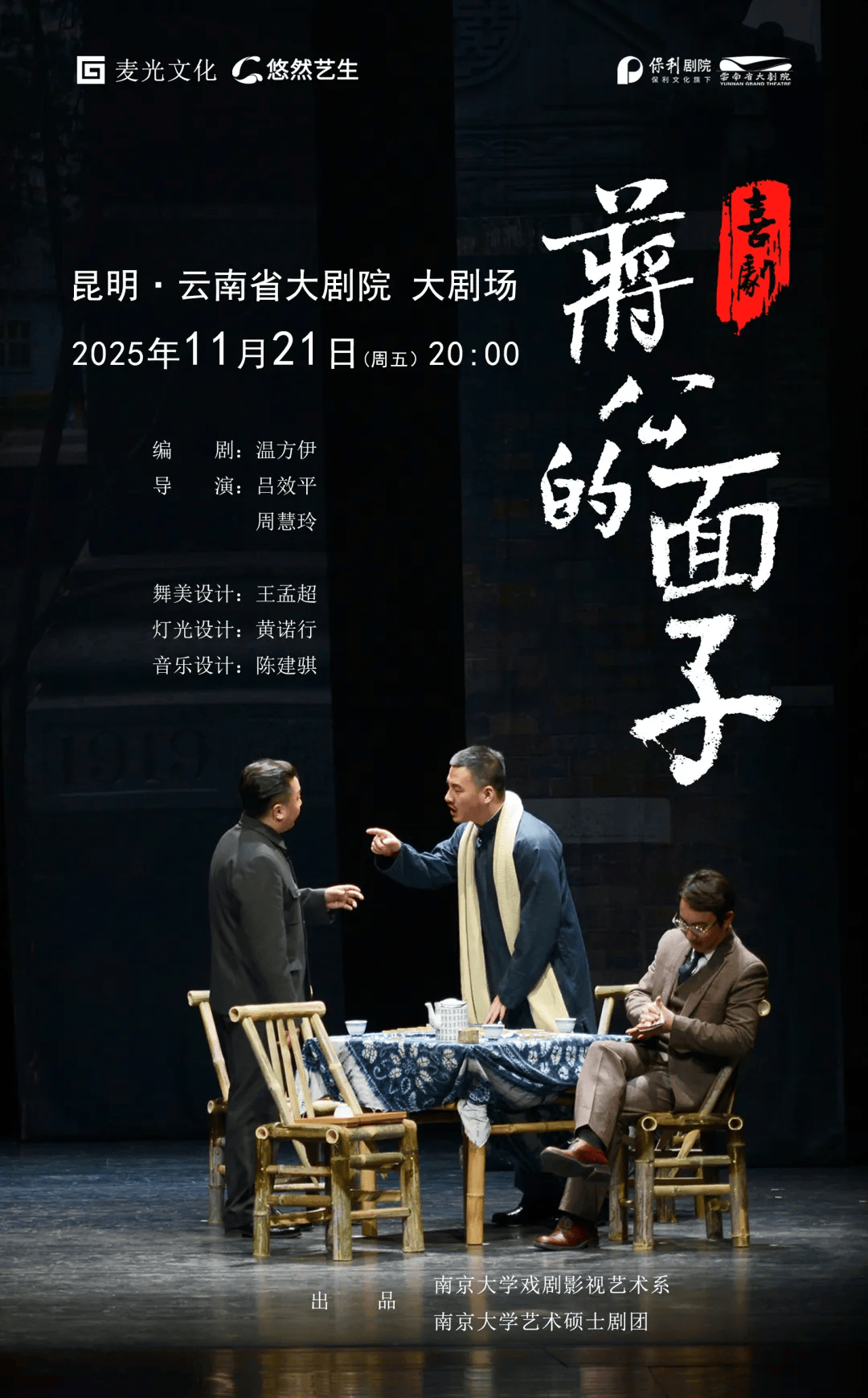 一部将民国知识分子灵魂放在火上炙烤的黑色喜剧;一部令近年中国话剧回归五四荣光的当代佳作。2012年诞生于南京大学并引爆关注,13年间已在世界范围演出逾500场。喜剧《蒋公的面子》重磅来袭,2025年11月21日 20:00 云南省大剧院开票倒计时。两个时空,三位教授,一个面子引发的“知识分子的精神困境”,这一次,让我们和教授们一起重回1940,感受历史里曾经生动过的往事,找寻藏在时间里的“饭局”真相。